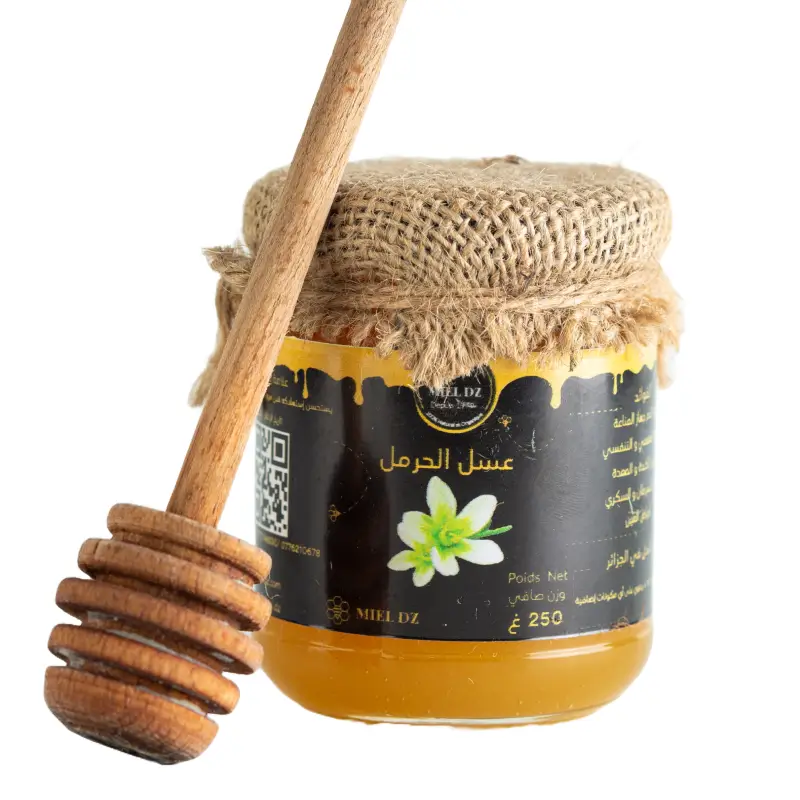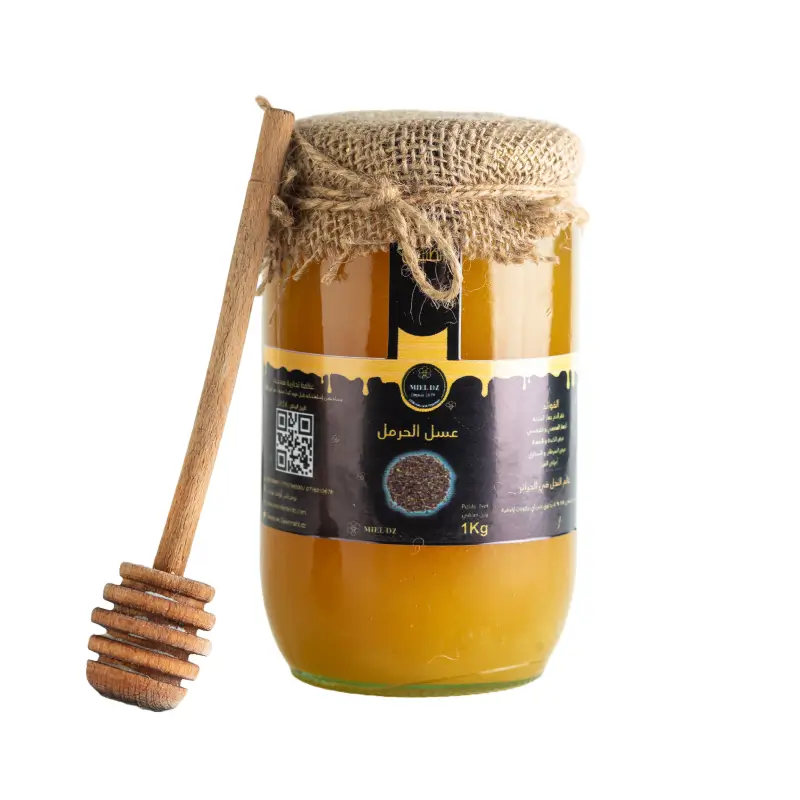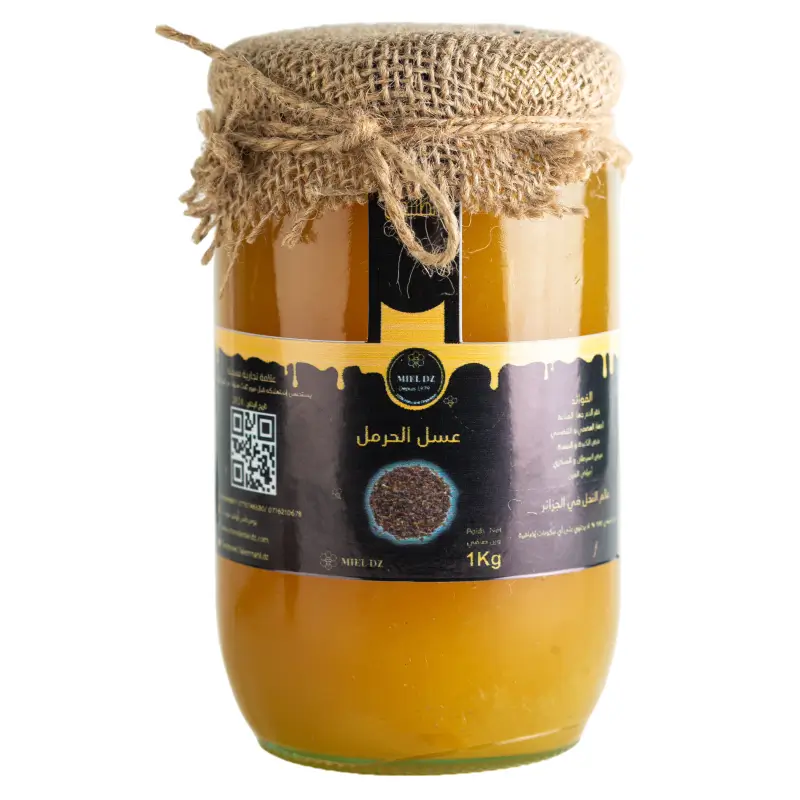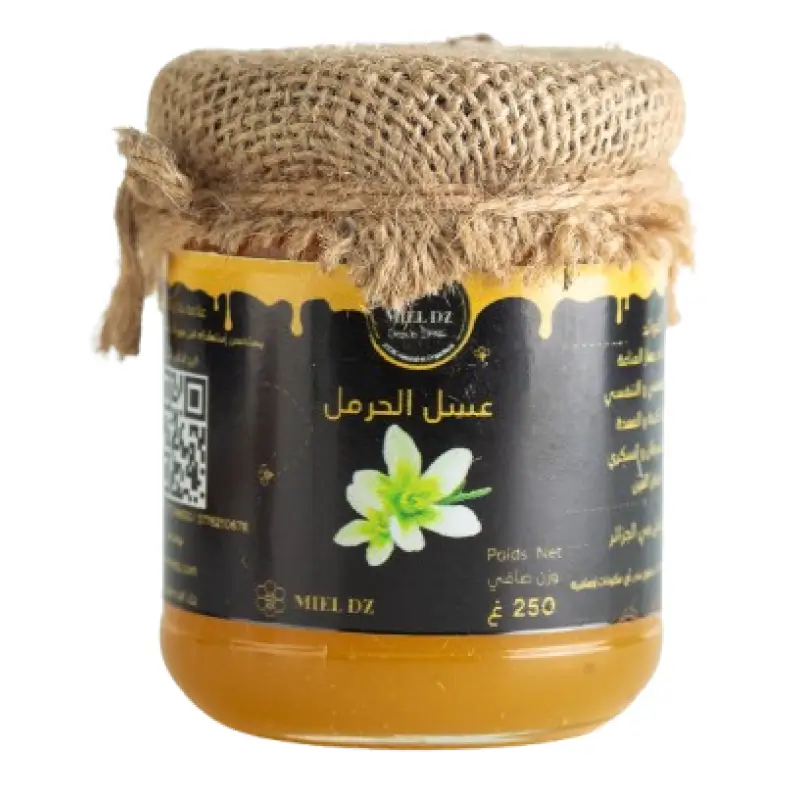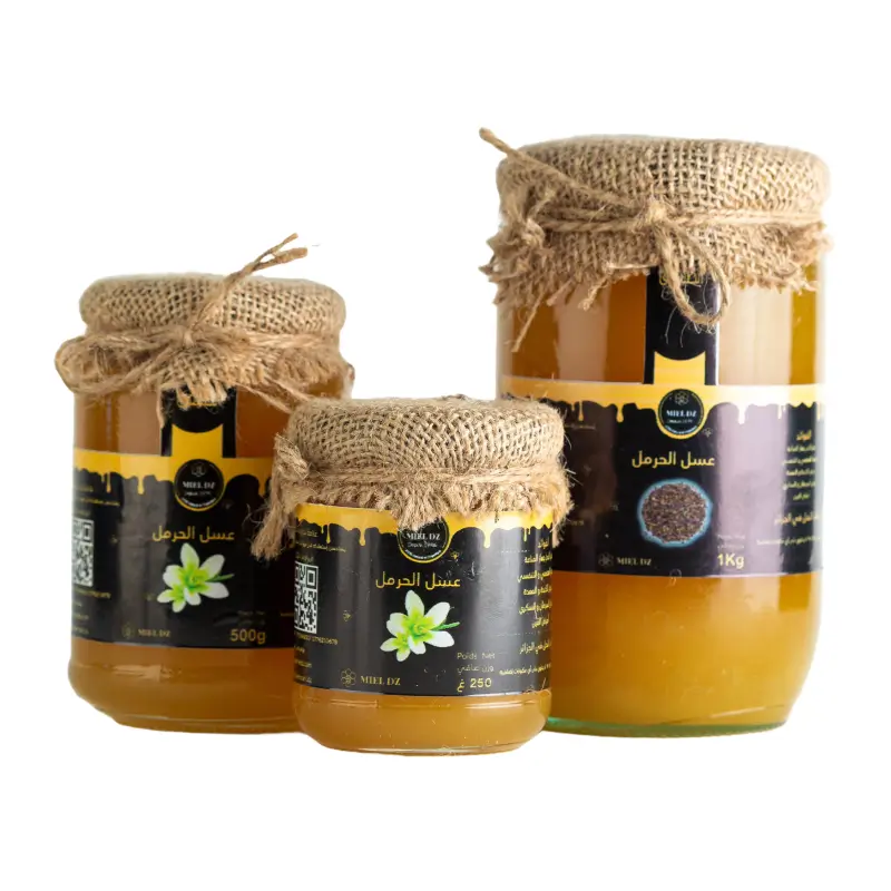 عسل الحرمل الطبيعي 100% والخاضع للتحاليل تثبت نقاوته، جزائري أصلي، يساعد في العلاج من العديد من الأمراض من بينها ضغط الدم، الحصوات والرمال في المرارة والكلى، مكافح جيد لأمراض السرطان والروماتيزم والسل زالسكر بالإضافة للعديد من الفوائد. متوفر في 3 أحجام.